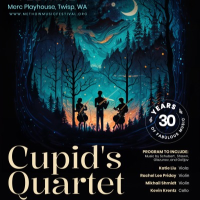 Join us for our Winter Concert Cupid's Quartet February 14 and or February 15, 2026 at the Merc Playhouse in Twisp WA. Enjoy great music by Schubert, Shawn, Glazunov and Golijov. This year, Katie Liu, Rachel Lee Priday, Mikhail Shmidt and Kevin Krentz will be Cupid's Quartet.