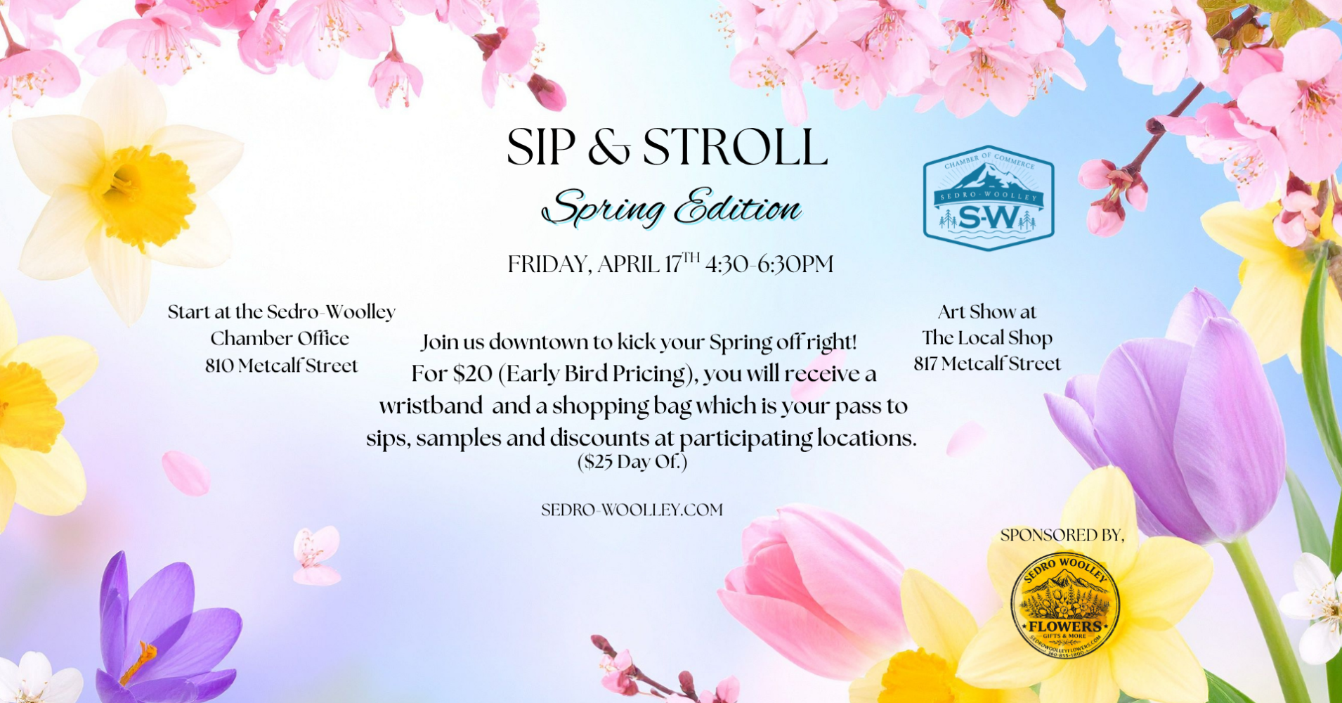 Join us downtown to kick your Spring off right! Avoid the Tulip traffic and come downtown to Sedro-Woolley to Eat, Sip, Shop & Stroll through town. Early bird pricing $20, you will receive a wristband and a shopping bag which is your passport to sips, samples and discounts at participating locations.($25 day of)